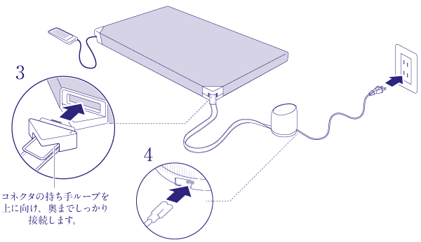 - コネクタを外す際は、持ち手ループを持ち、ゆっくりと引き抜きます。