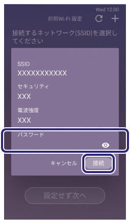 Wi-Fiネットワーク名をタッチした後、セキュリティで保護されている場合は、パスワード入力画面が表示されます。パスワード入力欄をタッチして、ソフトウェアキーでパスワードを入力後、[接続]ボタンをタッチしてください。