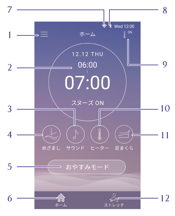 - 「NEWPEACE AI 睡眠トレーナーアプリ」を使用すれば、タブレットリモコンの代わりにお使いのスマートフォンから本品を操作できます(ホーム画面の見かた)。