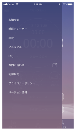- 「NEWPEACE AI 睡眠トレーナーアプリ」のバージョンを表示します。