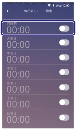 )にすると曜日一覧が表示されます。曜日をタッチするたびに、チェックマークの表示/非表示が切り替わり、チェックマークが付いている曜日に設定中の内容が適用されます。