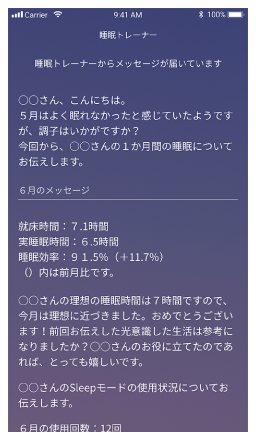 睡眠データに対し、AIからお客様に応じたメッセージが毎月届きます。