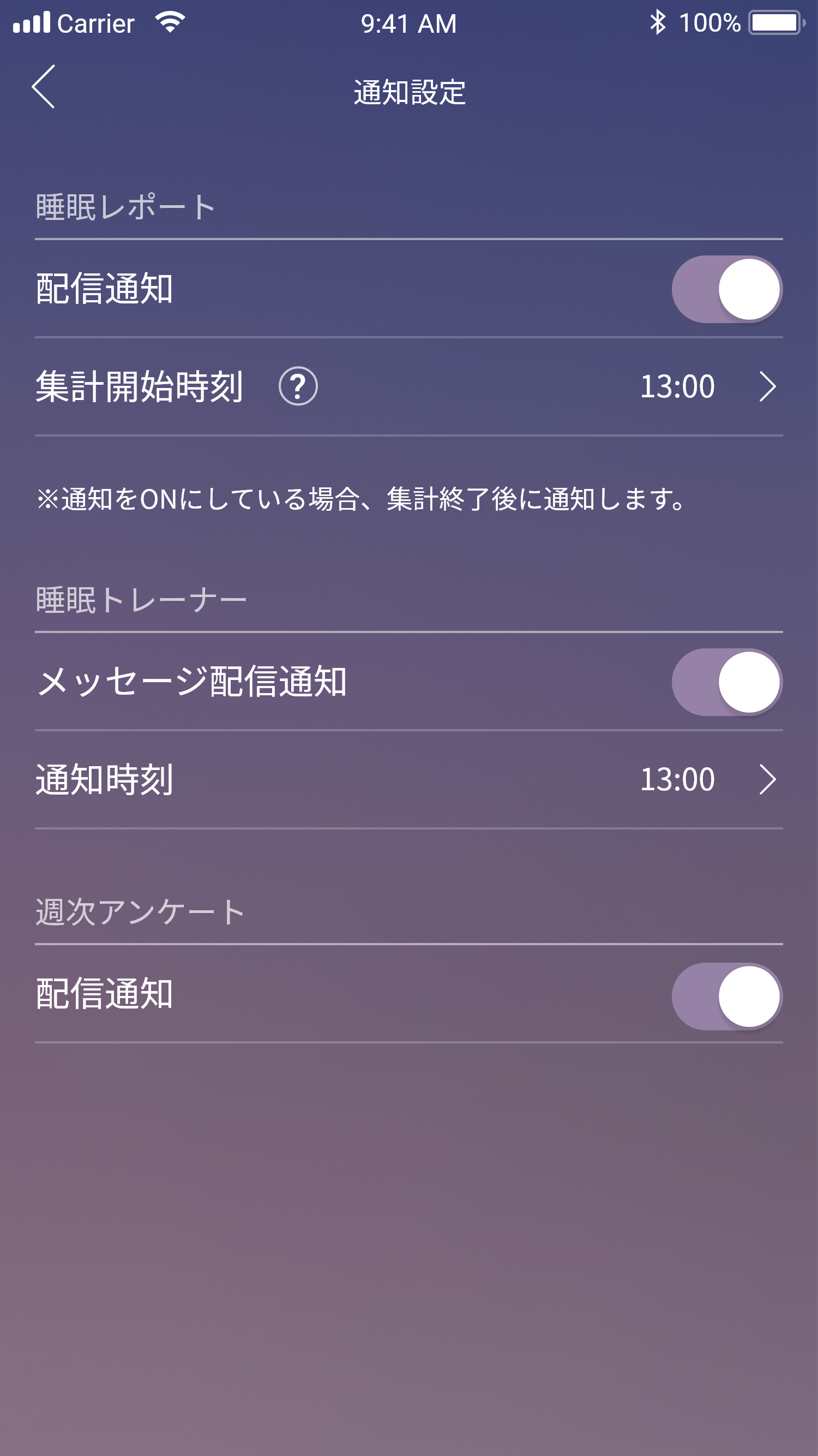 アプリの通知に関する内容や、睡眠レポートの作成時刻を設定できます。