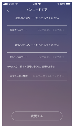 「パスワード変更」画面でアカウントの現在のパスワードと新しいパスワードを入力し、[変更する]をタッチします。
